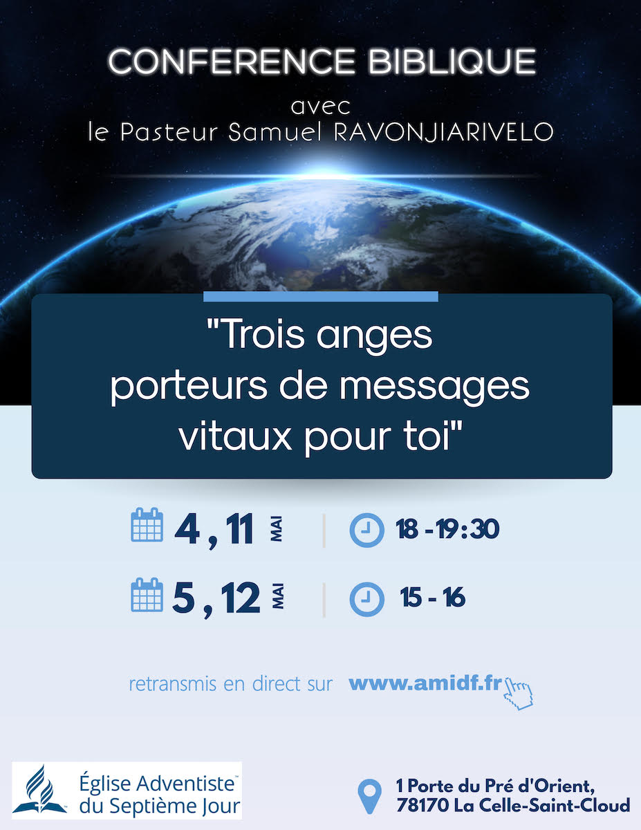 L’église Adventiste du septième jour de La Celle-Saint-Cloud vous invite à participer à une série de conférences bibliques intitulées Espérance 2019 : Trois anges porteurs de messages vitaux pour toi !