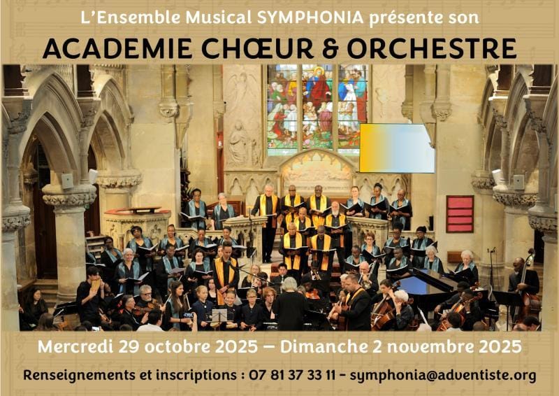 Alors n’hésitez pas à vous inscrire à l’ACADEMIE CHŒUR ET ORCHESTRE SYMPHONIA, dont la première session aura lieu à la fin des vacances d’Automne, du mercredi soir 29 octobre au dimanche midi 2 novembre 2025 à l’église adventiste de Neuilly-sur-Seine.