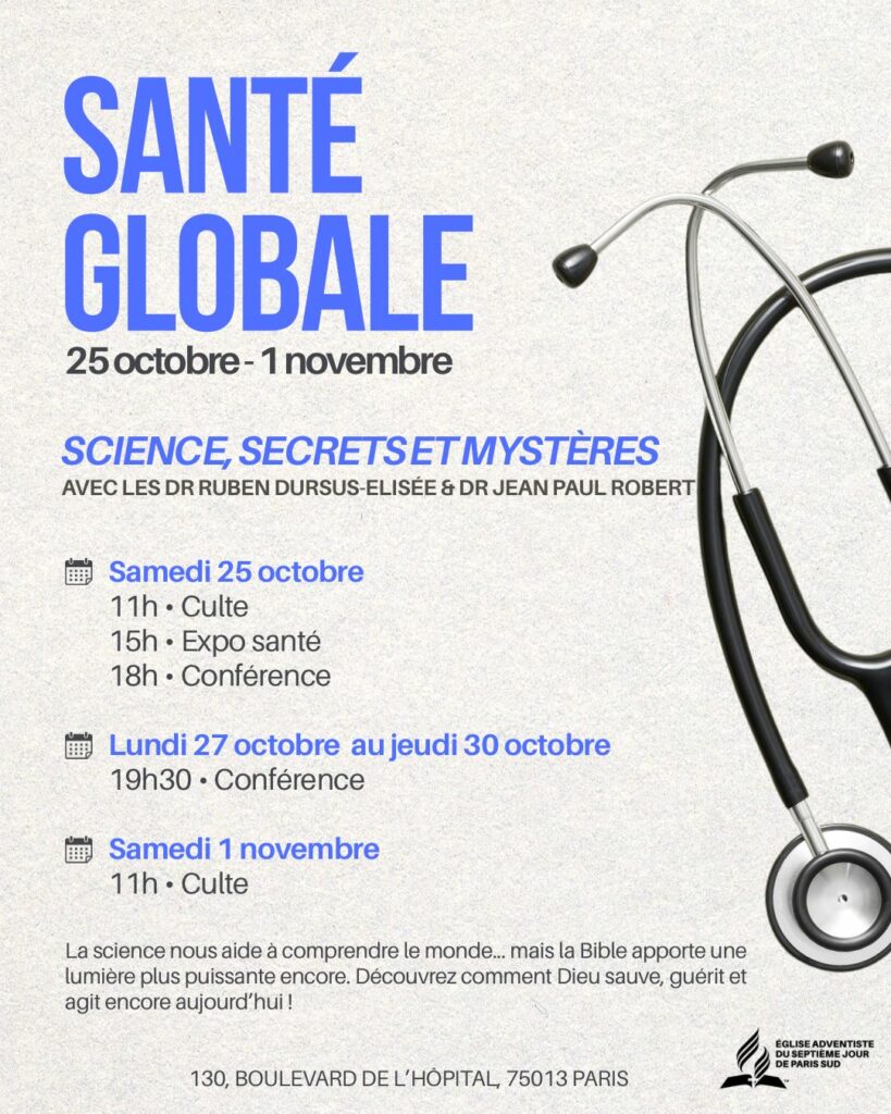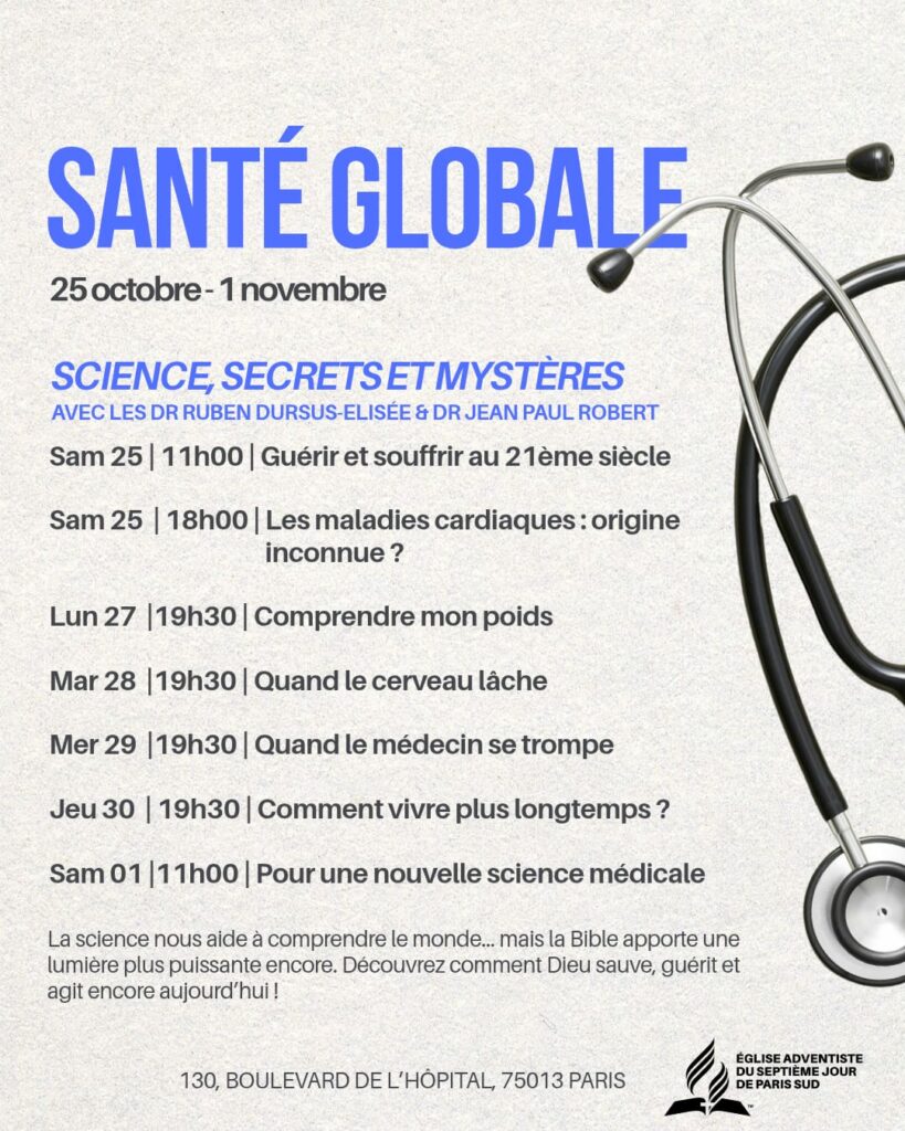 Du 25 octobre au 1ᵉʳ novembre, l’Église adventiste du 7ᵉ jour de Paris-Sud vous invite à une semaine exceptionnelle autour du thème : “Science, Secrets et Mystères”.