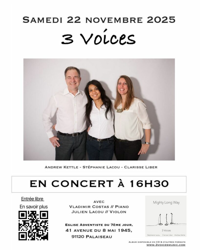 La journée se terminera par un concert exceptionnel du trio vocal 3 Voices, composé d’Andrew Kettle, Stéphanie Lacou et Clarisse Liber. Accompagnés par Vladimir Costas au piano et Julien Lacou au violon, ils proposeront un programme gospel inspirant, mêlant profondeur spirituelle et harmonies chaleureuses.