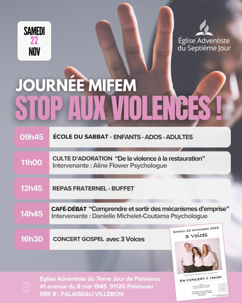 Le 22 novembre 2025, l’Église Adventiste du 7ᵉ Jour de Palaiseau consacre une journée entière à un thème essentiel : la lutte contre les violences. Organisée par le Ministère des Femmes (MIFEM), cette journée a pour objectif d’informer, sensibiliser, accompagner et ouvrir un espace de parole sécurisant autour d’un sujet trop souvent silencieux.
