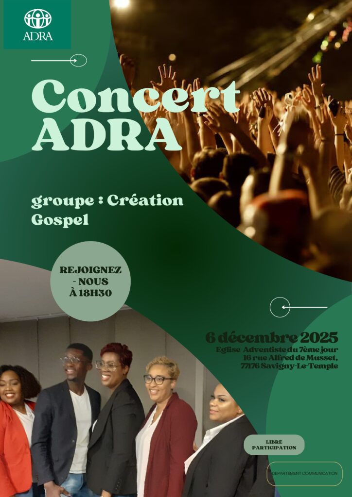un concert humanitaire et solidaire en faveur des projets d’ADRA Savigny pour l’année 2026, qui aura lieu samedi 6 décembre 2025 à 18h30, au Temple Adventiste de Savigny-le-Temple, situé 16 rue Alfred de Musset – 77176 Savigny-le-Temple.