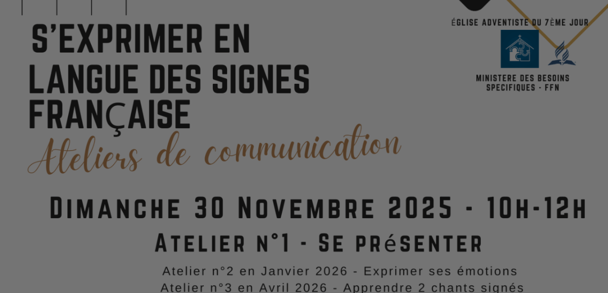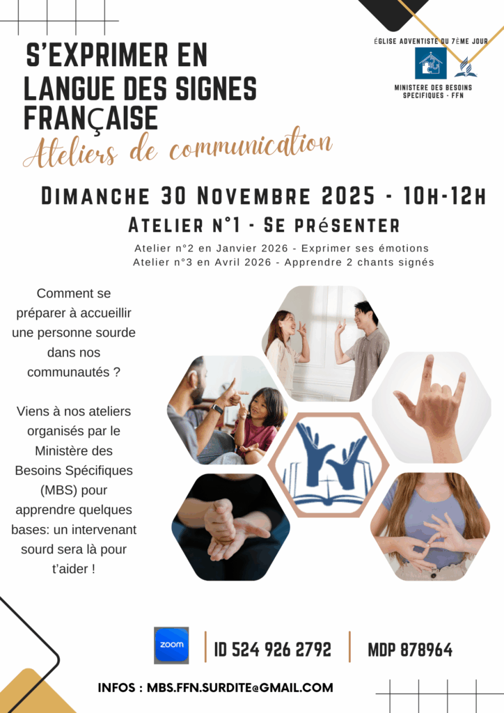 Le Ministère des Besoins Spécifiques (MBS) de la Fédération Adventiste France Nord lance une nouvelle initiative destinée à mieux accueillir les personnes sourdes au sein de nos communautés. Parce que chaque membre mérite d’être pleinement inclus, cette formation en ligne propose à toutes et à tous d’acquérir des bases simples et accessibles en Langue des Signes Française (LSF).
