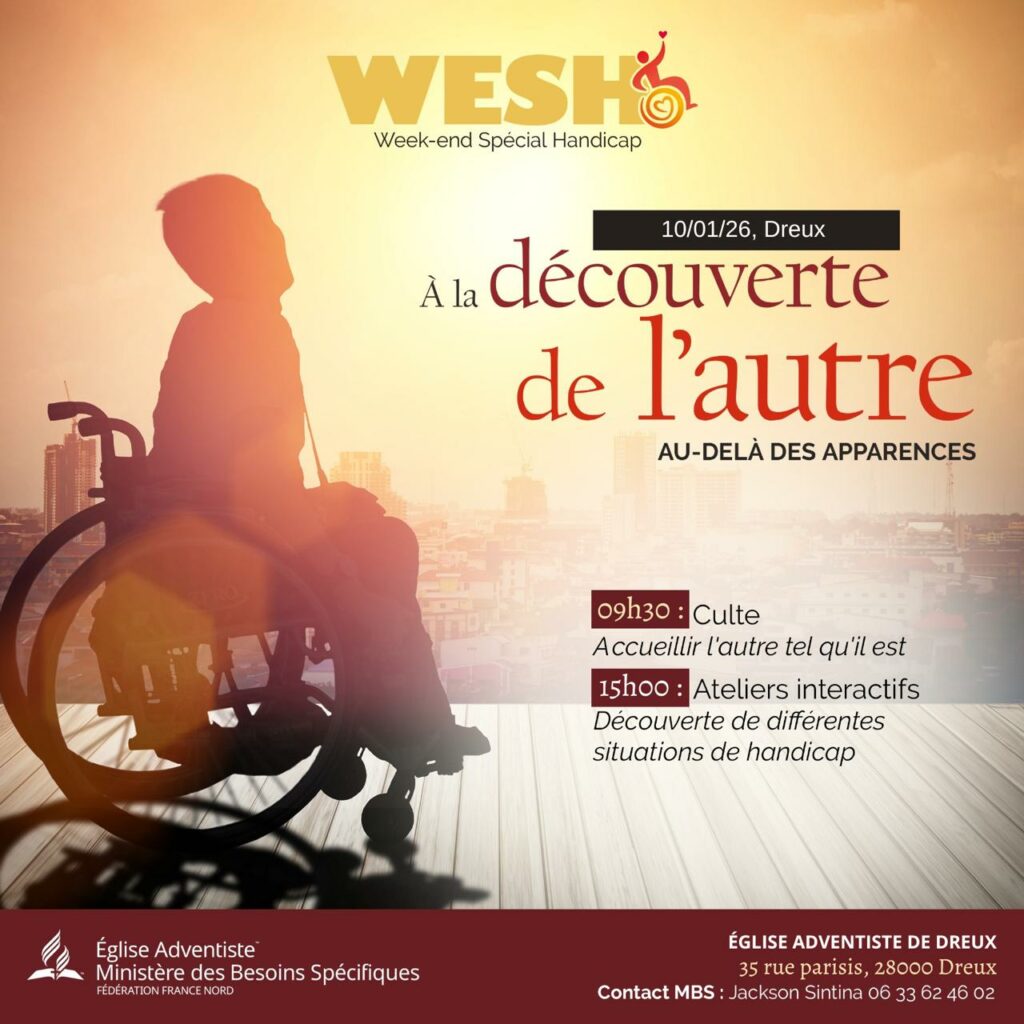 Le Week-end Spécial Handicap (WESH) arrive à Dreux avec une invitation simple et profonde : partir à la découverte de l’autre, au-delà des apparences. Rendez-vous le samedi 10 janvier 2026 à l’Église adventiste de Dreux pour une journée ouverte à tous, pensée pour mieux comprendre le handicap, changer notre regard et apprendre à accueillir chacun avec dignité et bienveillance.