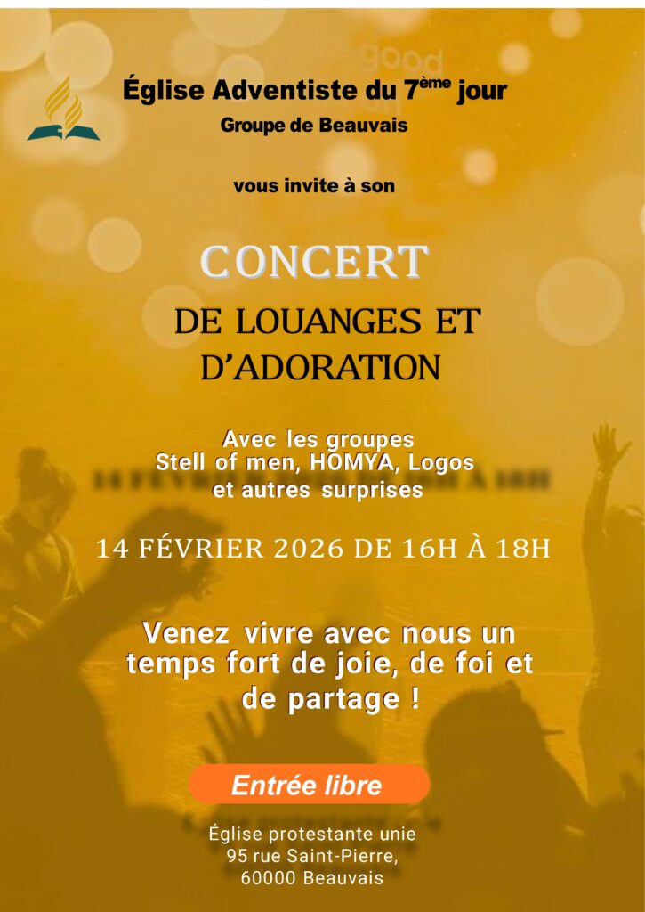 Le Groupe de Beauvais de l’Église Adventiste du 7e jour vous donne rendez-vous pour un concert de louanges et d’adoration placé sous le signe de la joie, de la foi et du partage. Un moment fort, ouvert à tous, pour chanter, prier, se laisser encourager et vivre une atmosphère spirituelle chaleureuse en communauté.