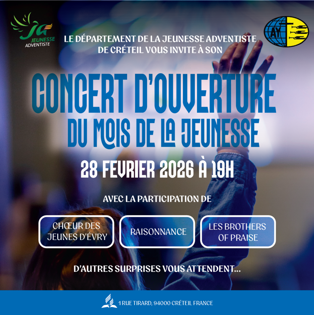 Le Mois de la Jeunesse commence par un temps fort. Le Département de la Jeunesse Adventiste de Créteil vous invite à son concert d’ouverture, le samedi 28 février 2026 à 19h, pour une soirée où la musique devient un langage de foi, de joie et de communion. Ce rendez-vous n’est pas une simple “date” dans un calendrier : c’est le point de départ d’un mois entier de dynamique jeunesse, et l’occasion de se rassembler, d’ouvrir l’année avec intention et de célébrer ensemble.