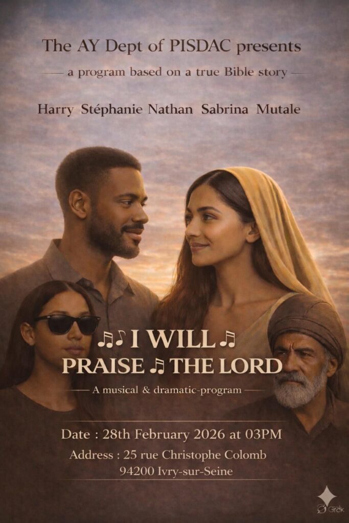 Le département AY (Jeunesse) de PISDAC vous invite à vivre un moment fort de louange et d’émotion avec “I Will Praise the Lord”, un programme musical et dramatique basé sur une histoire vraie de la Bible. À travers la musique, la mise en scène et le témoignage, ce rendez-vous veut rappeler une vérité simple : même au cœur des épreuves, Dieu demeure digne de confiance… et de louange.