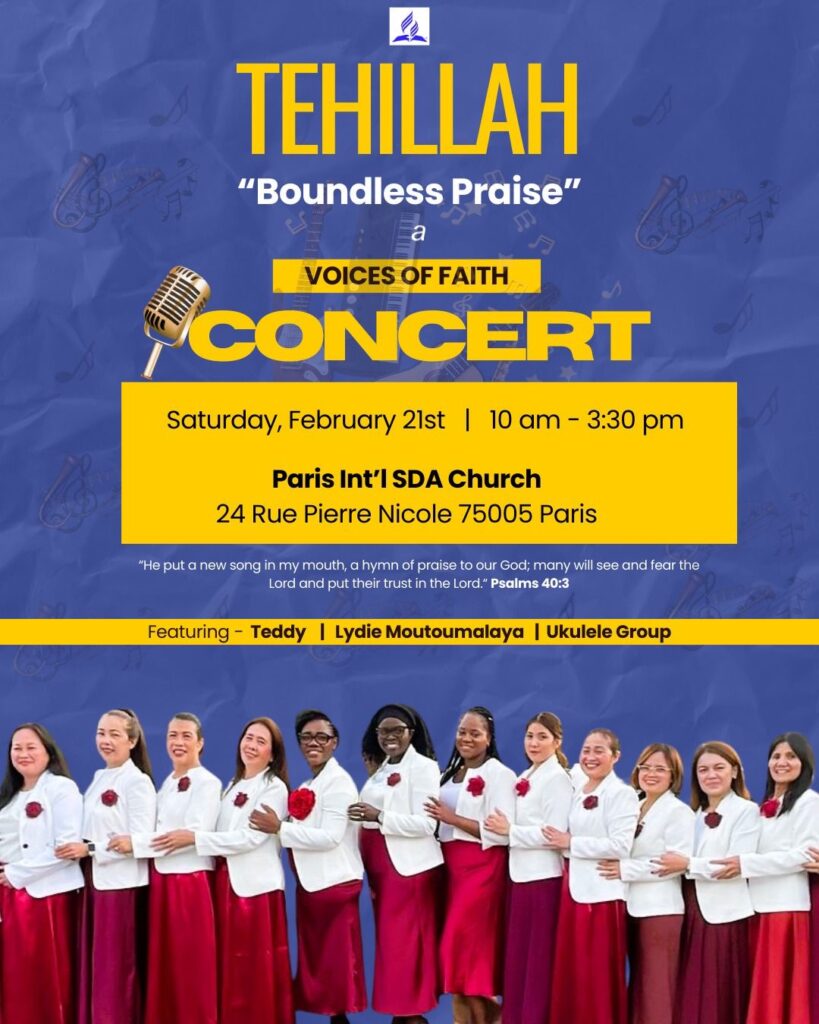 Le concert aura lieu le samedi 21 février, de 10h00 à 15h30, à la Paris Int’l SDA Church, située au 24 Rue Pierre Nicole, 75005 Paris.