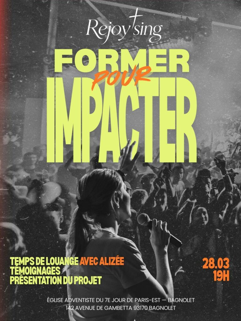L’église adventiste du 7e jour de Paris-Est – Bagnolet accueillera, le 28 mars à 19 heures, une soirée de présentation du projet musical Rejoy’Sing, au 142 avenue de Gambetta, 93170 Bagnolet. Placée sous le thème « Former pour impacter », la rencontre proposera un temps de louange avec Alizée, des témoignages ainsi qu’une présentation du projet.