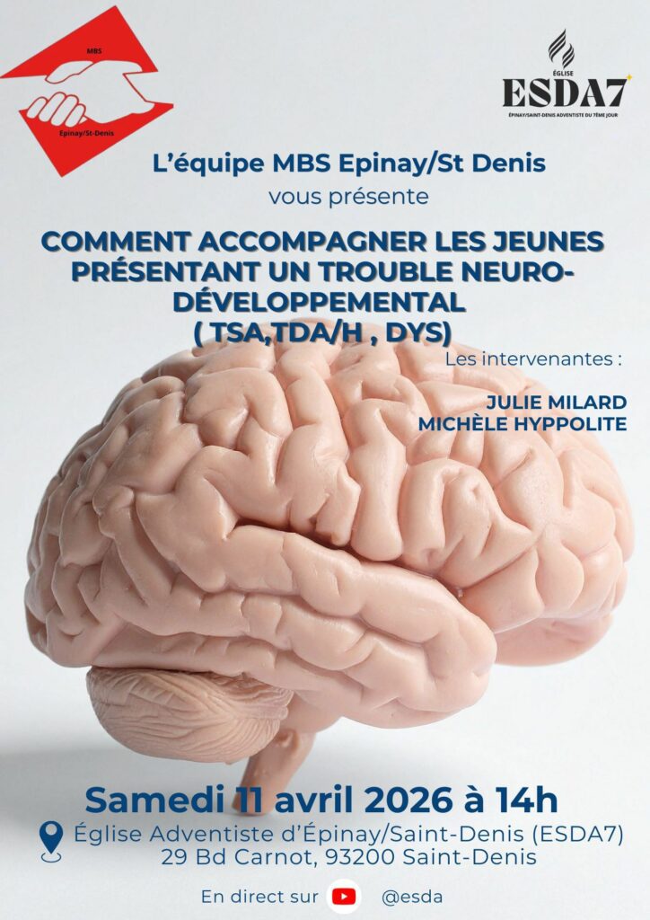 L’équipe MBS Épinay/Saint-Denis organise un rendez-vous de sensibilisation et de réflexion autour d’un sujet essentiel : l’accompagnement des jeunes présentant un trouble neurodéveloppemental, qu’il s’agisse des TSA, du TDA/H ou des troubles DYS. Cette rencontre se tiendra le samedi 11 avril 2026 à 14h, à l’Église Adventiste d’Épinay/Saint-Denis, située au 29 boulevard Carnot à Saint-Denis, et sera également diffusée en direct sur la chaîne @esda.