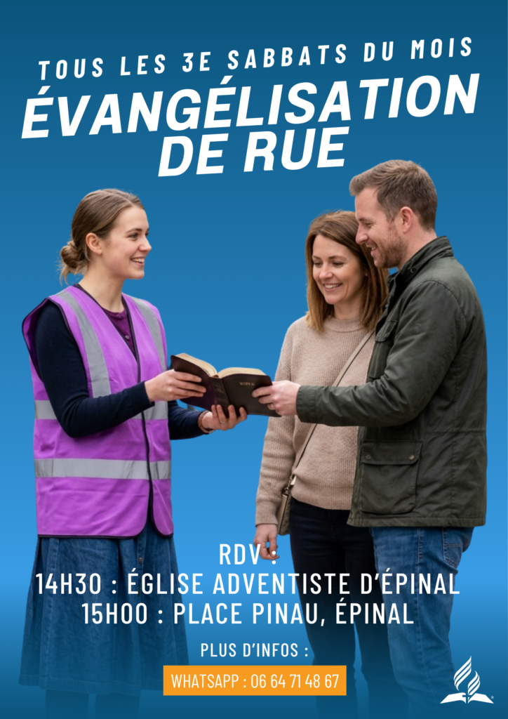 Si tu as à cœur de partager ta foi et de semer des graines d’espérance, on a une super nouvelle pour toi : chaque 3e Sabbat du mois, nous investissons les rues d’Épinal, et nous n’attendons que toi !