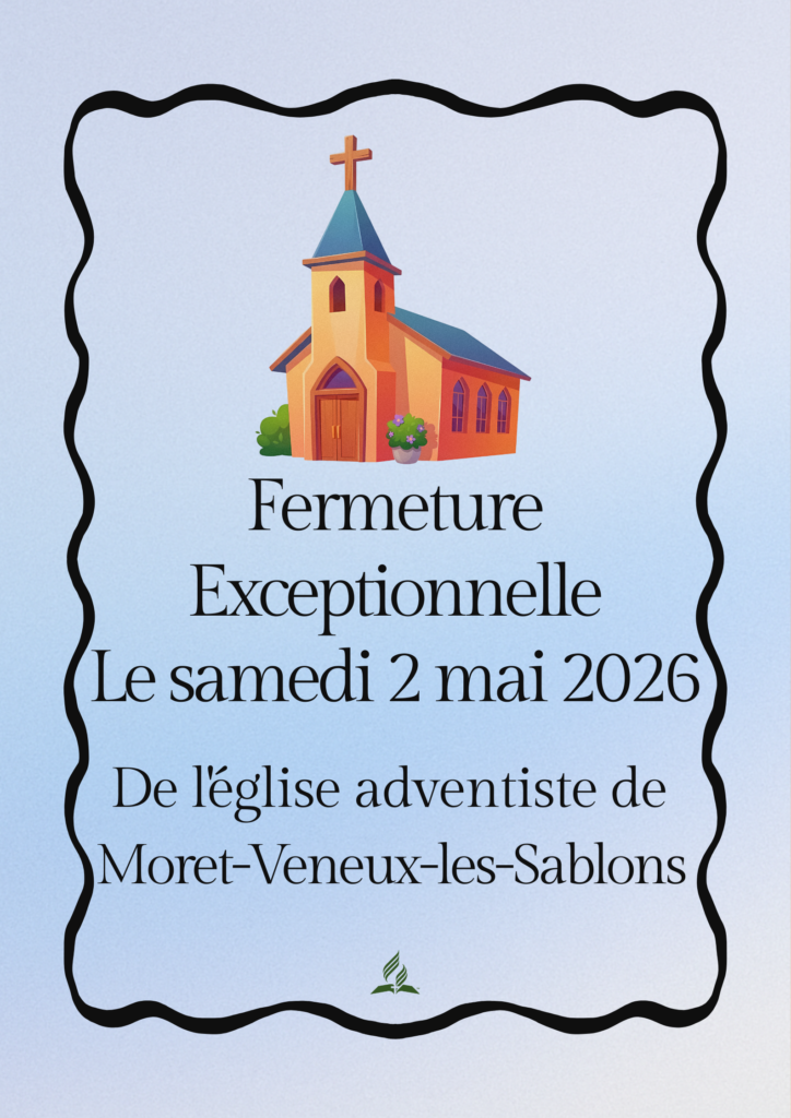 L’église adventiste de Moret-Veneux-les-Sablons sera exceptionnellement fermée le samedi 2 mai 2026. Cette annonce concerne les membres habituels de la communauté locale ainsi que les visiteurs qui avaient prévu d’y participer au culte ce jour-là.