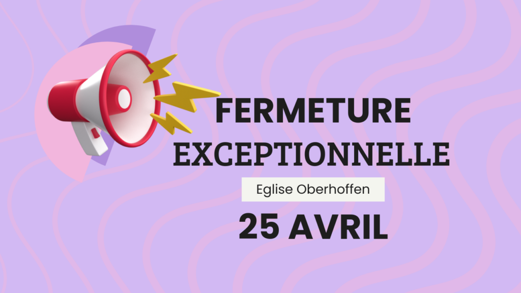 Nous remercions chacun pour sa compréhension concernant la fermeture exceptionnelle de l’église d’Oberhoffen le 25 avril et nous encourageons vivement tous ceux qui le peuvent à prendre part à ce rassemblement à Strasbourg.